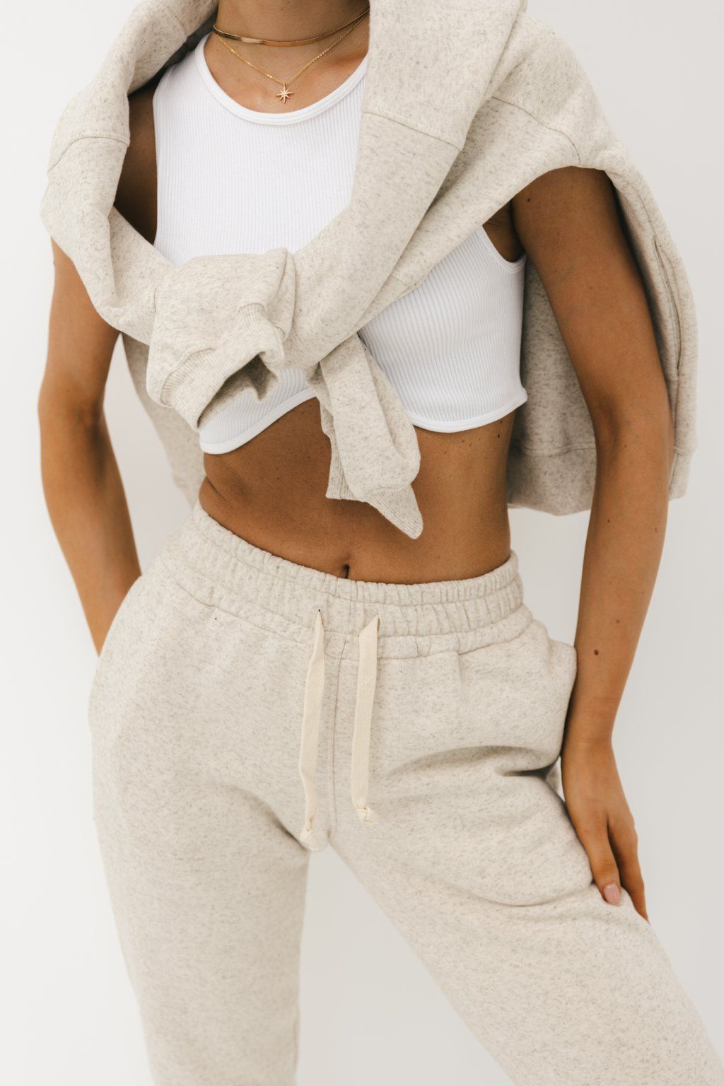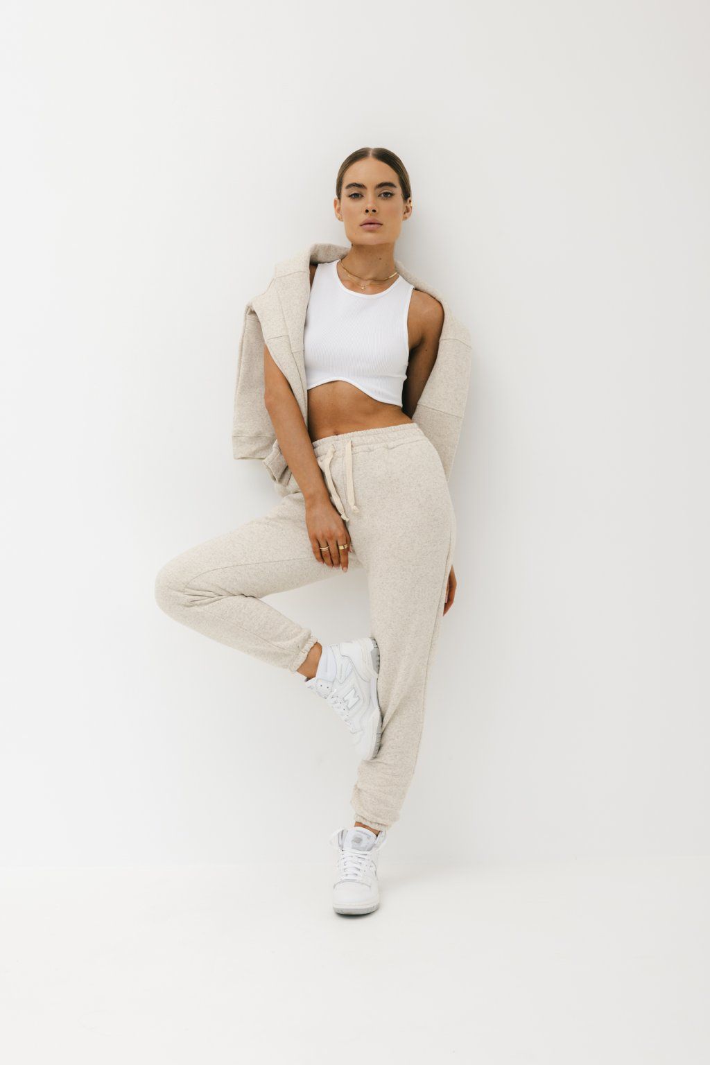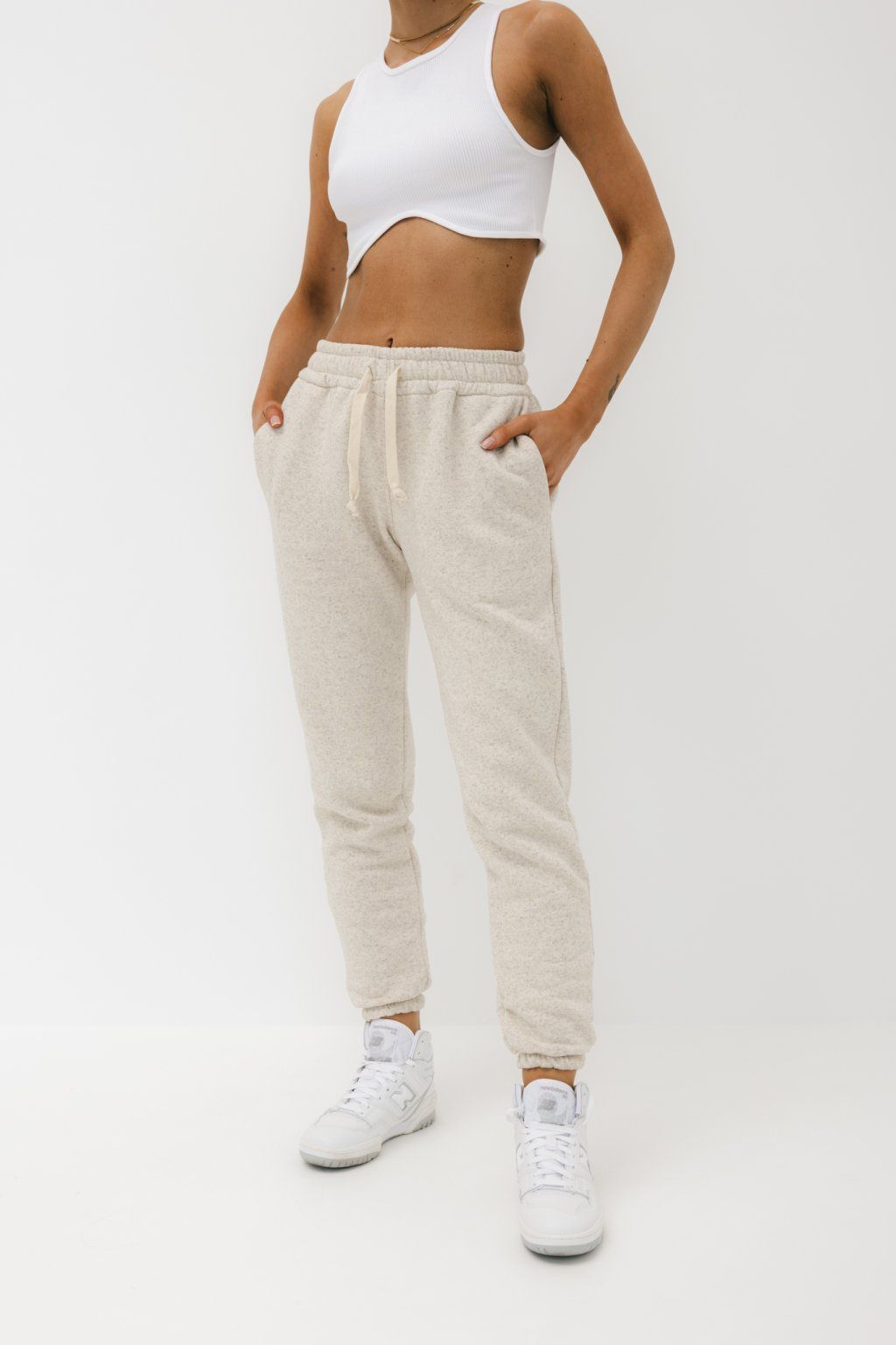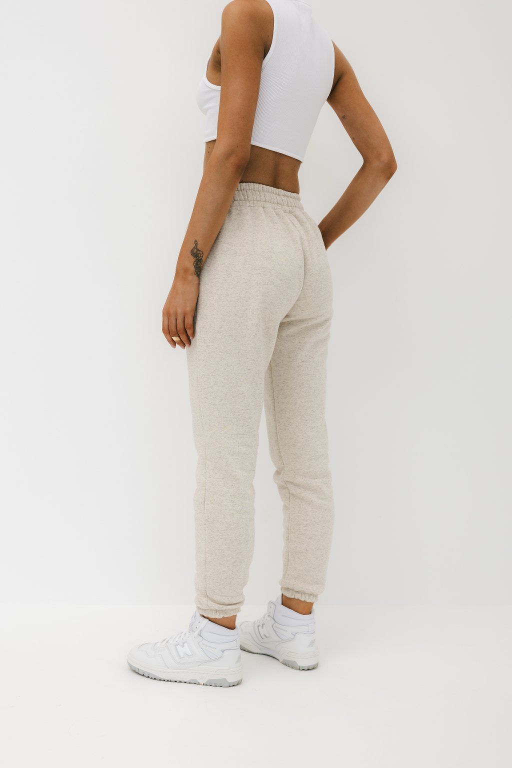 Tyto dámské tepláky bubelo jsou vyrobeny z pohodlné a ekologicky šetrné směsi bavlny, konopí a polyesteru (75 % bavlna, 15 % konopí, 10 % polyester) s certifikací OEKO-TEX Standard 100. Tepláky v přírodním béžovém melanži mají v pase širokou gumu, která poskytuje komfort a přizpůsobivost, a bavlněnou šňůrku v přírodní barvě pro snadné stažení a stylový vzhled. Spodní část nohavic je zakončena elastickým lemem, který udržuje nohavice na místě. Na bocích najdete dvě praktické kapsy, zatímco zadní část je hladká bez kapes, což dodává teplákům čistý, minimalistický vzhled.