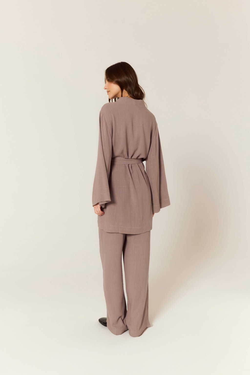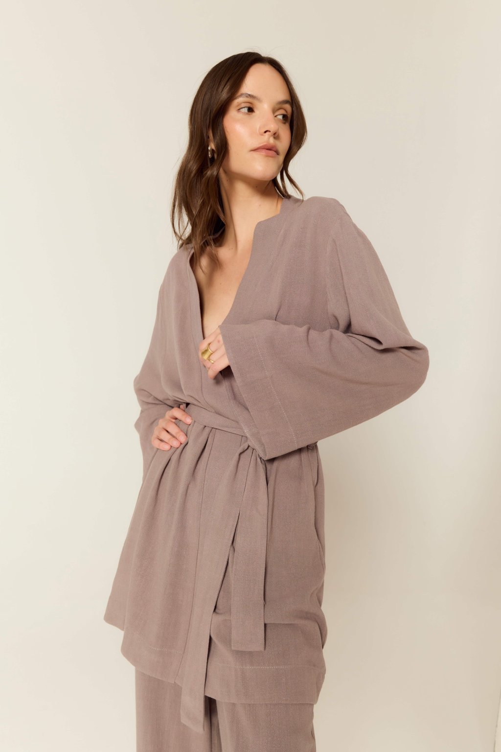Tento prodloužený kimono přehoz můžete nosit samostatně jako šaty, volně přes spodní prádlo nebo jako lehký kabátek k našim kalhotám ze stejného materiálu. V kombinaci s krátkou verzí topu a kalhotami v barvě Organic Grey vytvoříte promyšlený a stylově sjednocený outfit. Všechny tři produkty byly navrženy tak, aby se daly snadno mezi sebou kombinovat a přizpůsobit podle denní nálady i příležitosti.