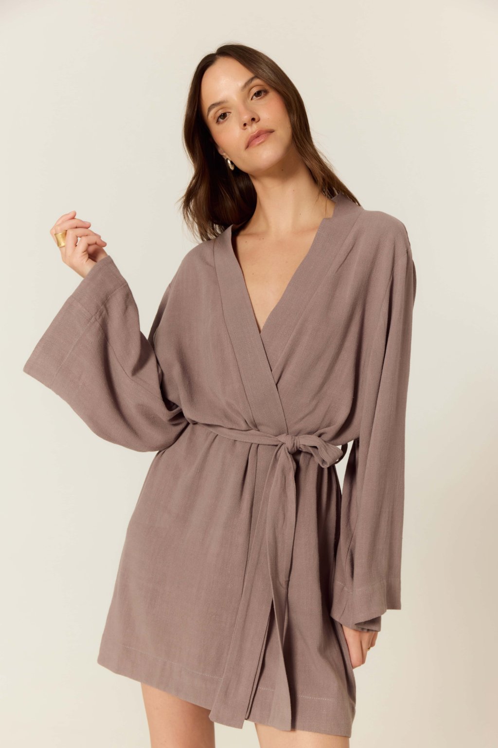 Model má prodloužený střih sahající ke kolenům, volné kimono rukávy a zavazování v pase na samostatný pásek ze stejného materiálu. Stejně jako kratší verze topu, i tato varianta je vybavena vnitřní šňůrkou všitou do bočního švu, která slouží k vnitřnímu zavázání a zajišťuje stabilitu při nošení – žádné rozevírání, žádné obavy z nechtěného odhalení. Tento chytrý detail přispívá k pohodlí i elegantnímu vzhledu.