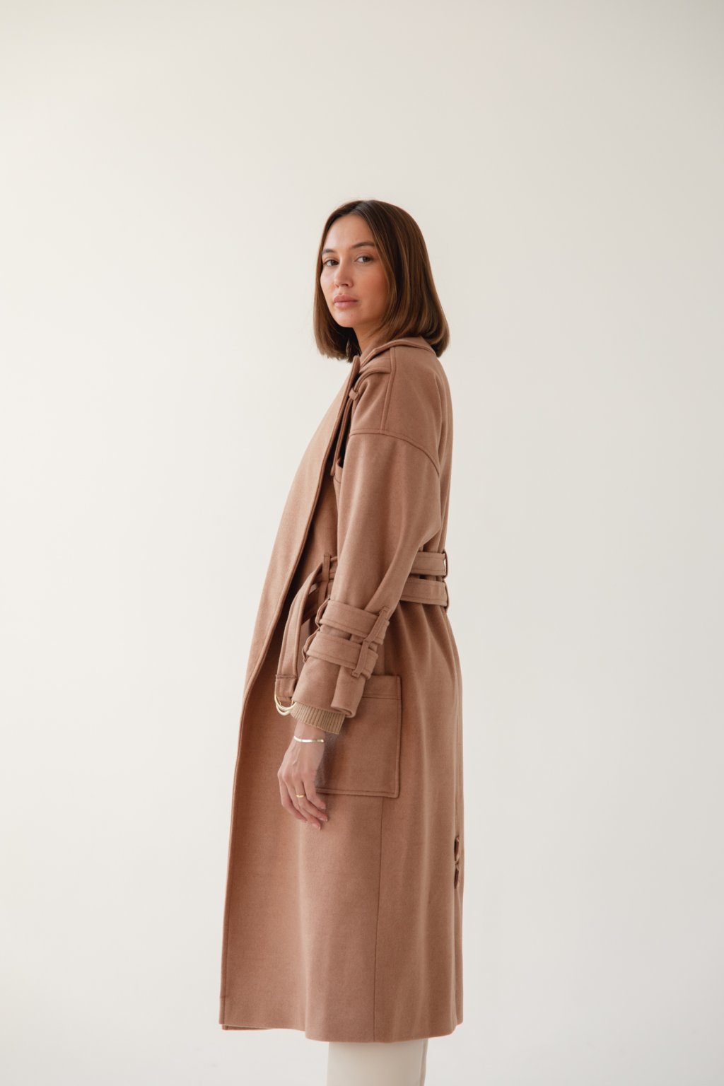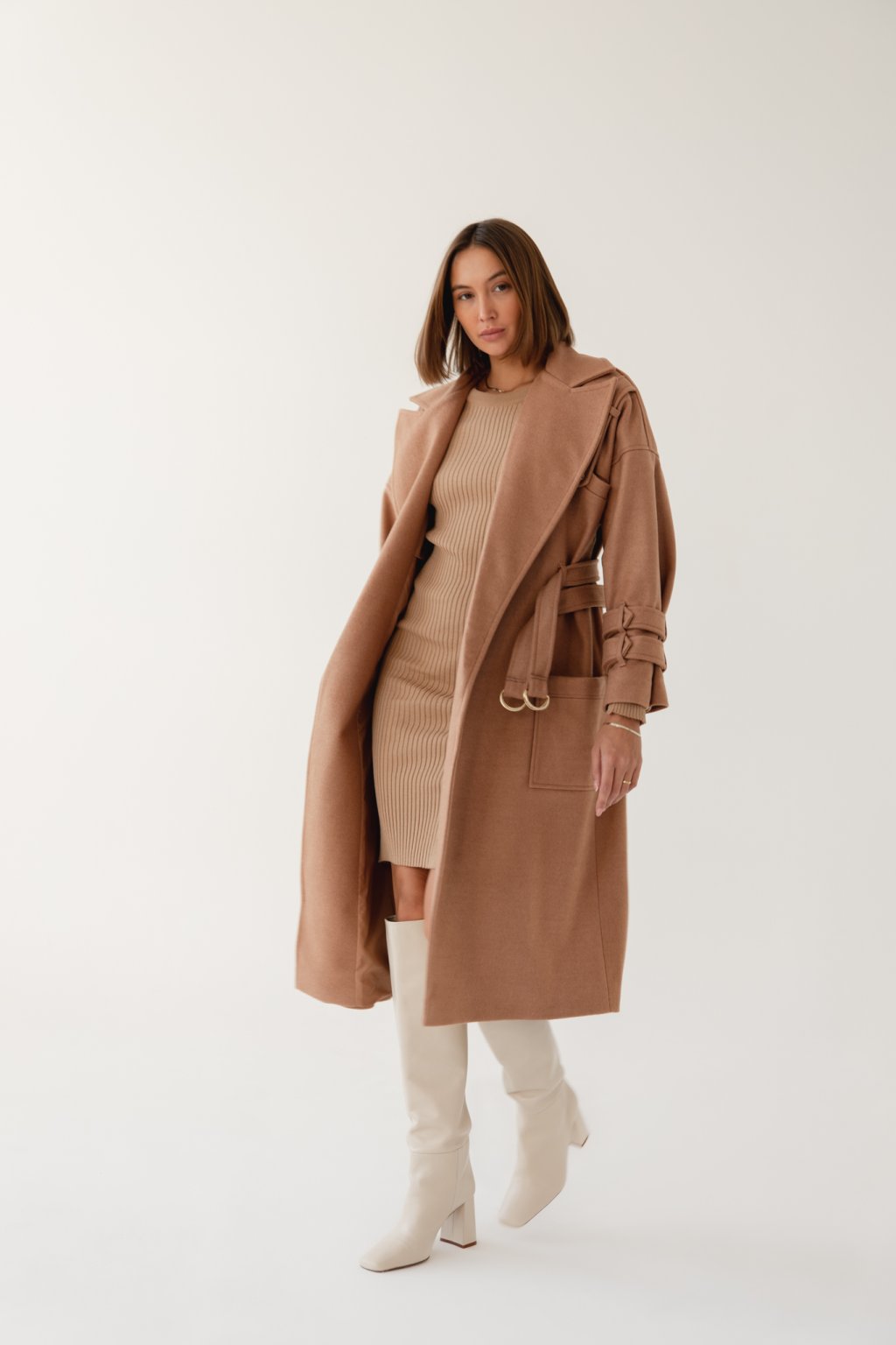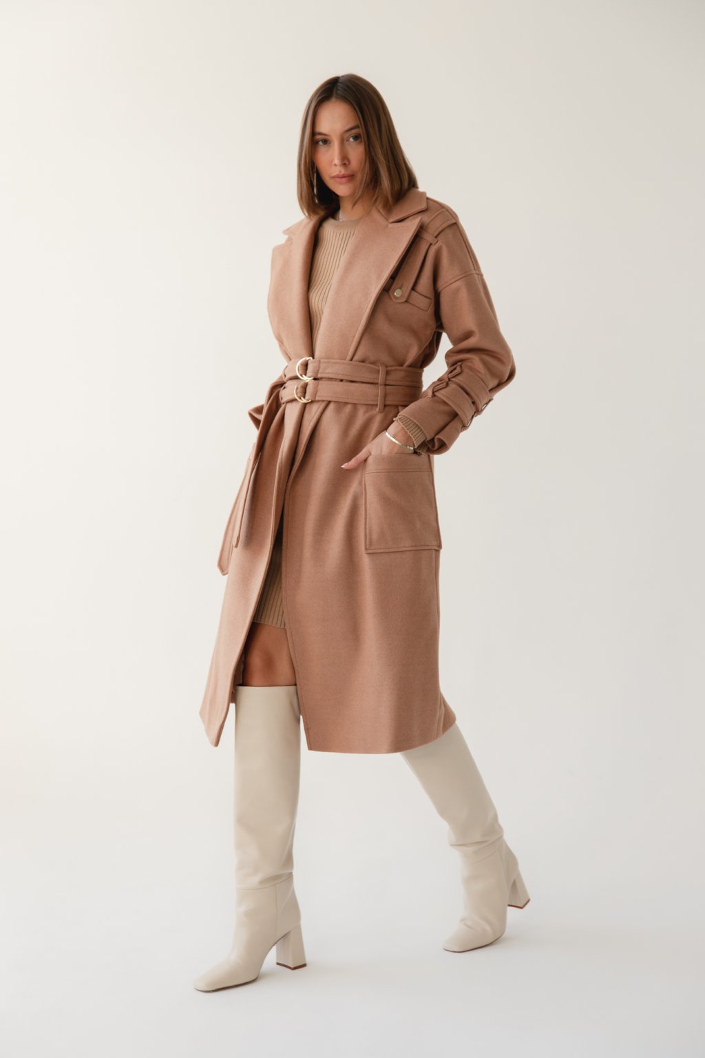 Béžový, ale rozhodně ne nenápadný. Takový je kabát s dvojitým opaskem pro ženy, které chtějí vyniknout.