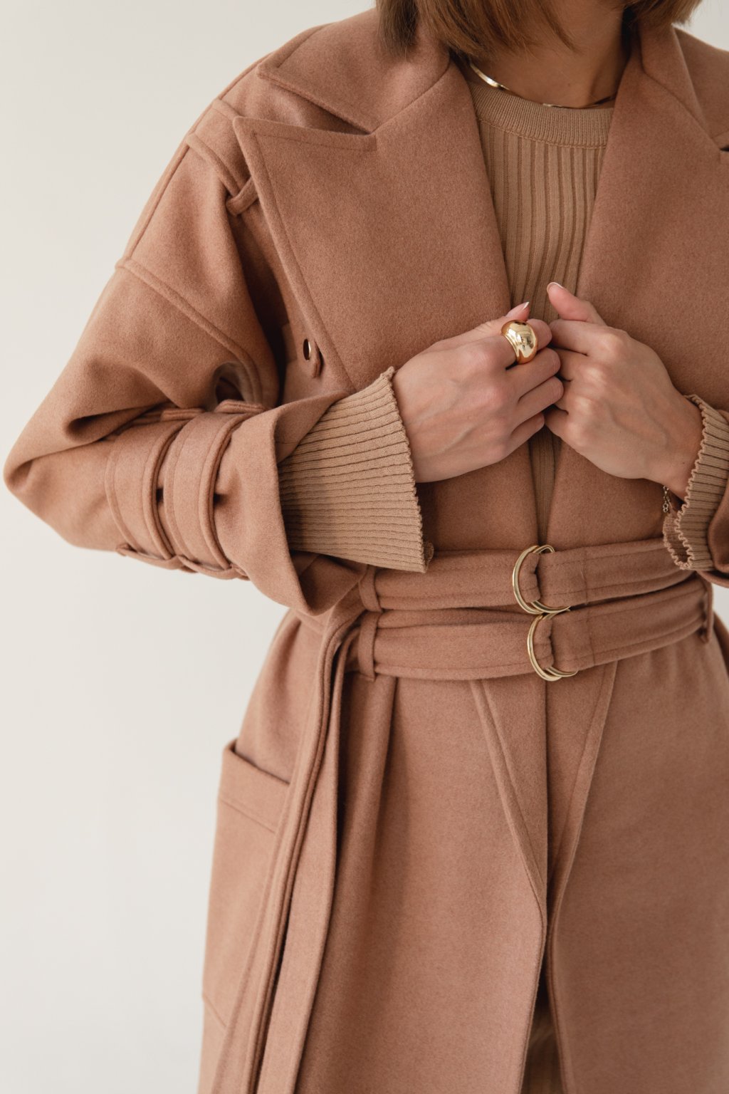OVERSIZE VLNĚNÝ KABÁT S DVOJITÝM OPASKEM, CAMEL BARVA